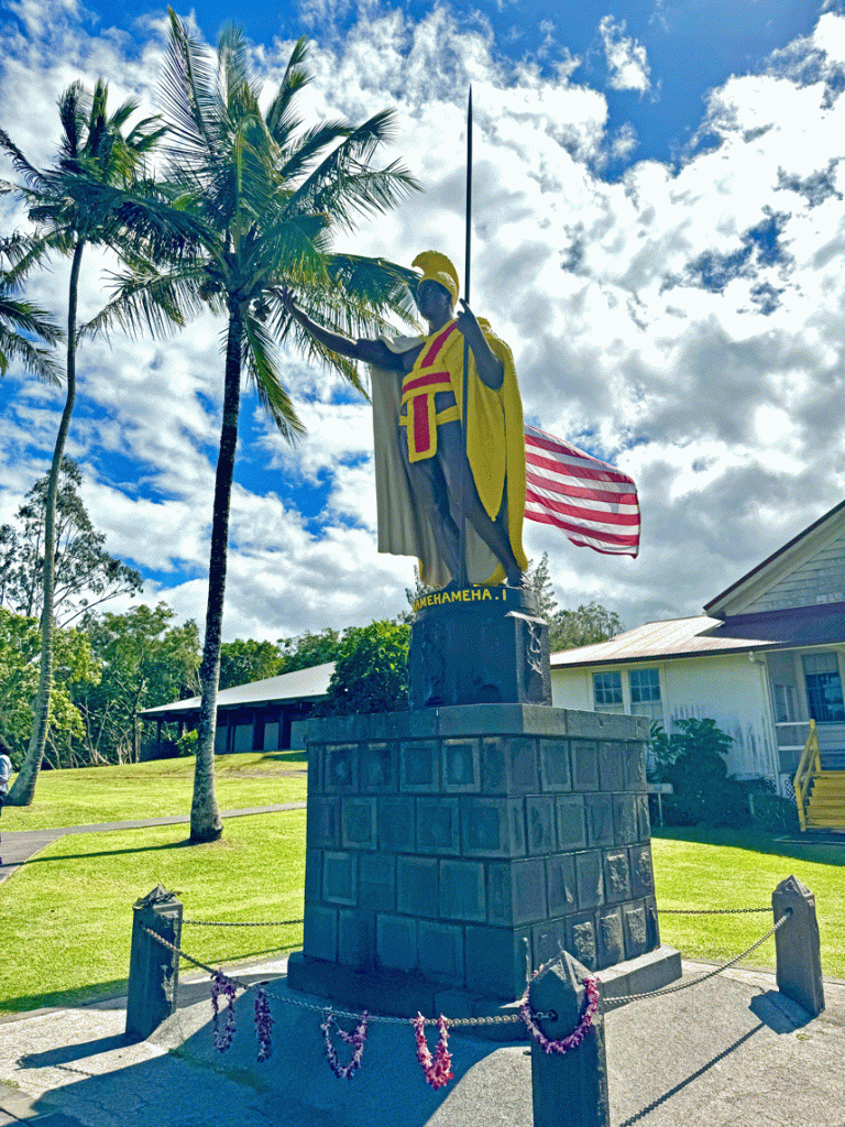 We backtracked to the small town of Kapa’au, where every restaurant and cafe seemed busy, so at least all the tourists were helping the local economy. A statue of King Kamehameha the Great is in a park in this small town. This statue is a lot like the one standing in front of the Judiciary building in Honolulu. Back in 1878, the statue was being shipped from Paris when the ship and cargo was lost at sea. The Hawaiian Legislature used the insurance money to order a new one. Sometime later, the captain of the wrecked ship saw the lost statue in Port Stanley where someone had salvaged it. He bought it and sent it to Hawaii. The broken arm was repaired and it now stands in this park near to the birthplace of King Kamehameha I. In ancient times, the king wore a cape made of bird feathers. Imagine how many Amakihi birds would have perished to provide all those feathers!