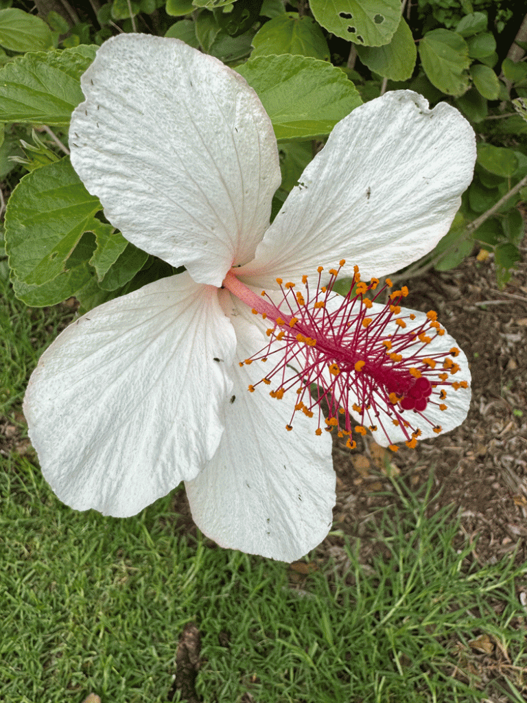 We took the Kohala Mountain Road south to the city of Waimea. Waimea is at 2,600 feet so it was cool enough for us to be comfortable. It was only mid-afternoon and we had nowhere that we had to be, so we found a pretty park (Waimea Nature Park) and wandered around looking at birds. There were beautiful hibiscus bushes. (And our blog from a trip to Hawaii should include at least one flower photo.)