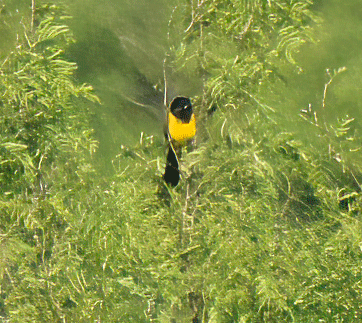 Wendy left the group at the feeding station and wandered nearer to the entrance, and met other birders who had heard and briefly seen the rare bird we were looking for. She messaged the others and soon we all were searching the thicket going back and forth and over to another trail and back again. A couple of Canadian birders joined us in the frenzy. Finally, all of us saw the female Crimson-collared Grosbeak. Here’s the best photo that Doug captured. The male of this species has a crimson collar, and the female is a drab greenish with a black hood. The Crimson-collared Grosbeak is native to a limited area of northeastern Mexico so it was nice that this one found the grounds of the Audubon Center so appealing.