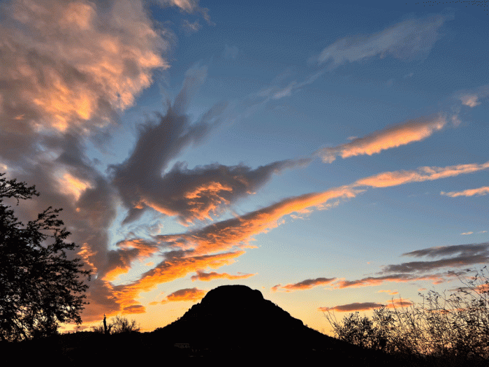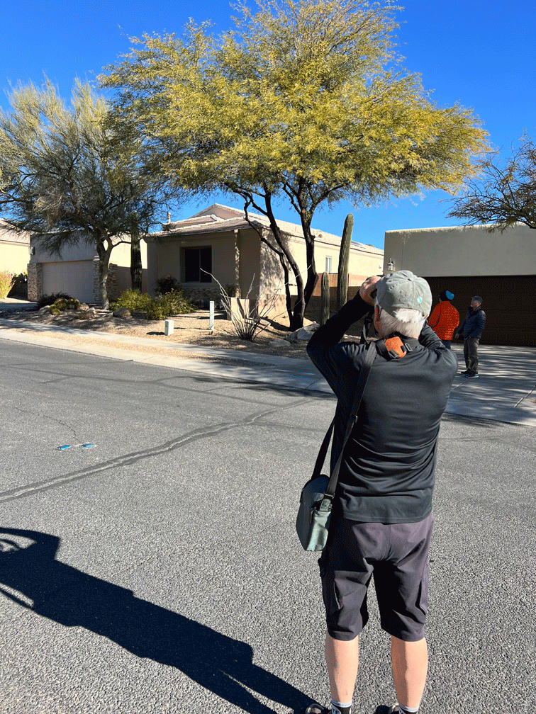 We have only ever seen Elegant Trogons in Madera Canyon, so we were intrigued when one was reported in a Dove Mountain neighbourhood. Since the “stakeout” spot was only a few minutes from the Tortolita Preserve where we go mountain biking, we decided to swing by and see if we could spot it. When we got there, a birder and a resident had already located it. Here is a cellphone photo of the trogon.