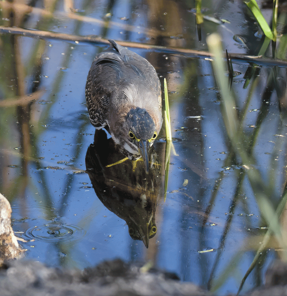 This Green Heron was poised to catch its dinner, although it looks a little like it is practicing its “scary look” in the water’s reflection.