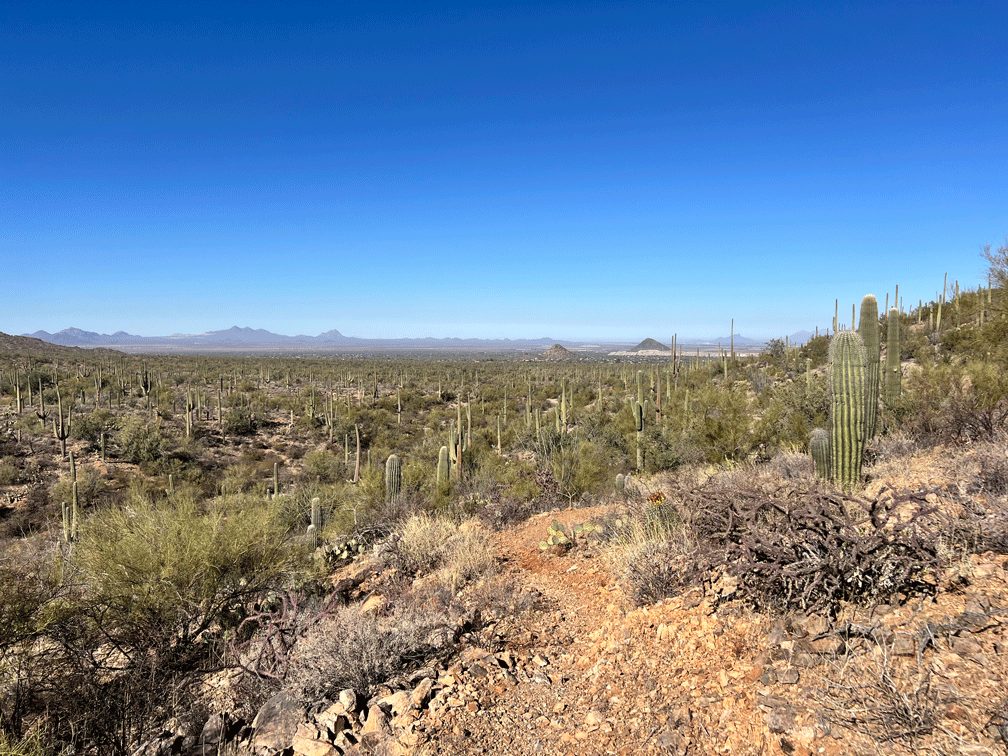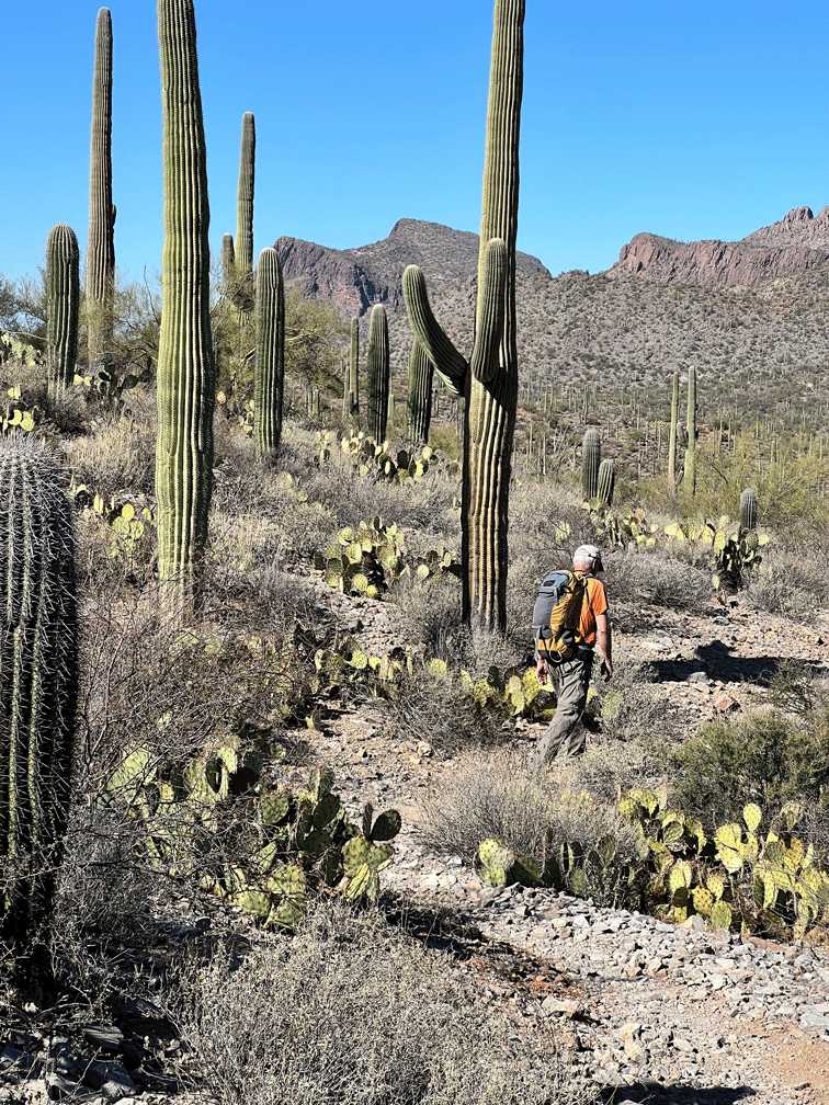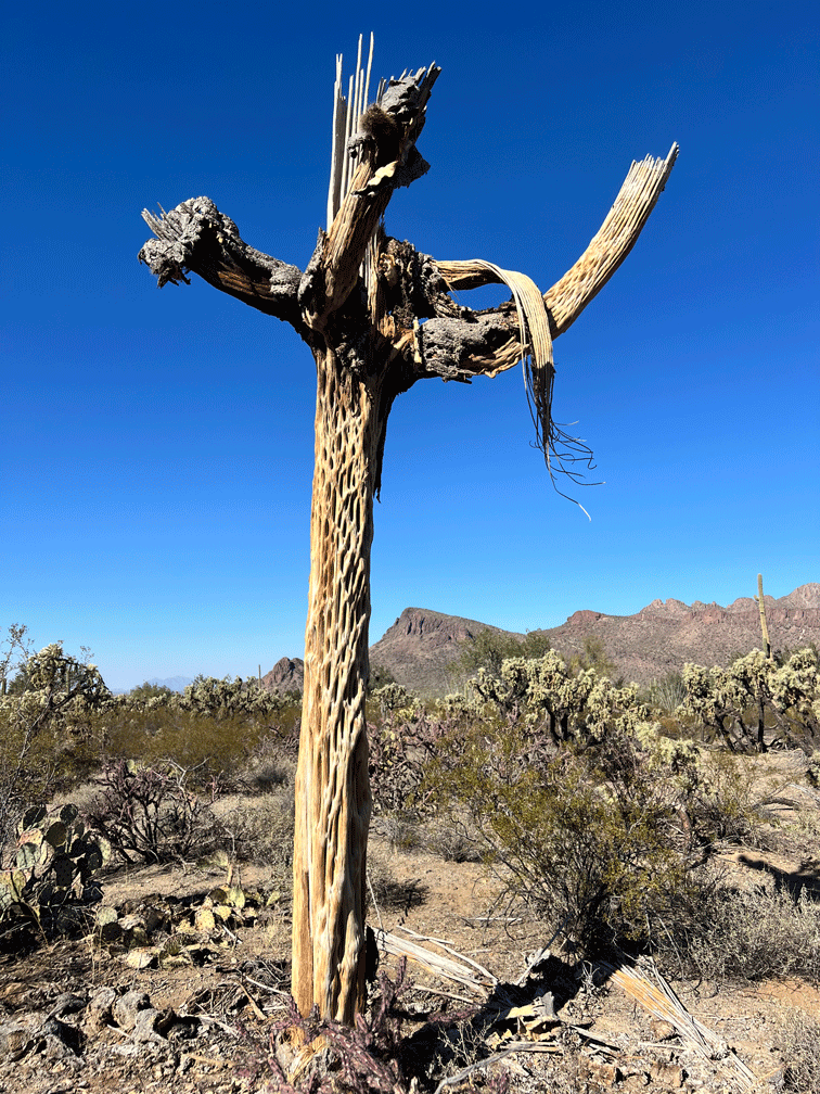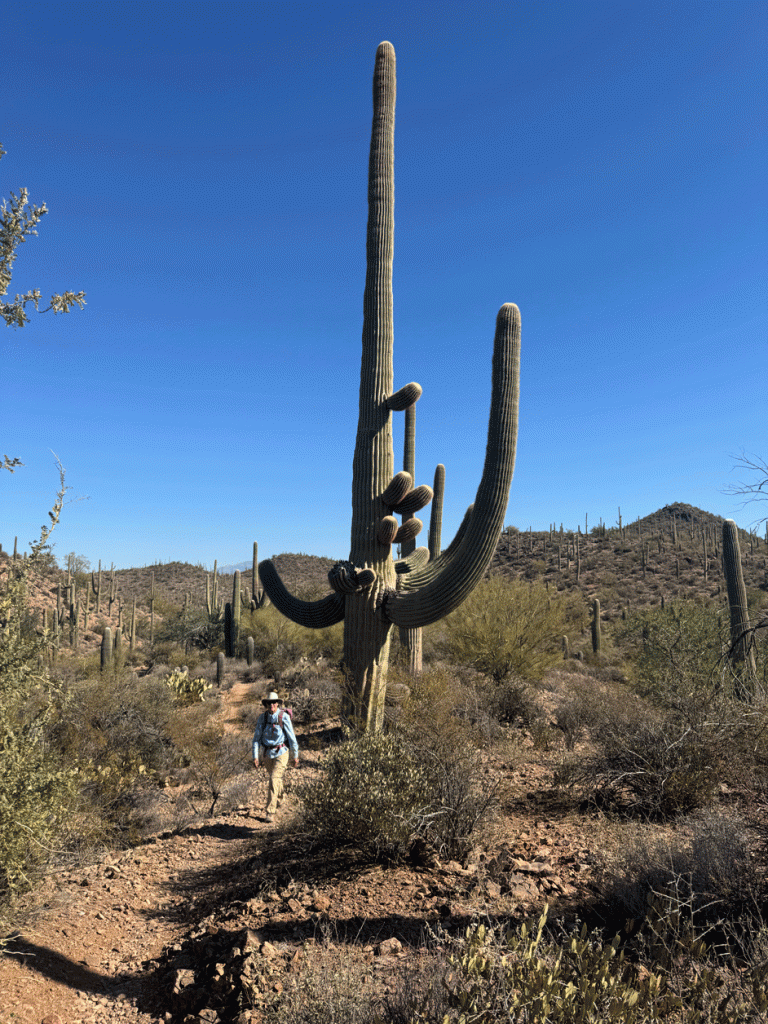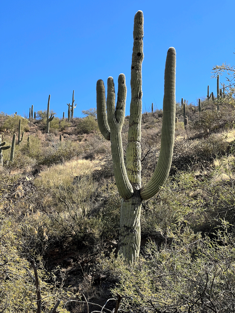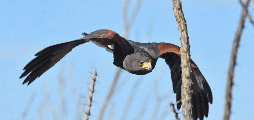 The Raptor Free Flight show was not very crowded on one of our visits to the Arizona-Sonora Desert Museum, so we joined the audience. We love watching the Harris’s Hawks swoop close to the ground as they take the most direct route to the food that the trainer has left for them. We sometimes have a family of Harris’s Hawks hunting together near our yard.