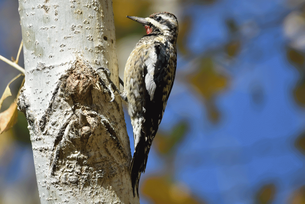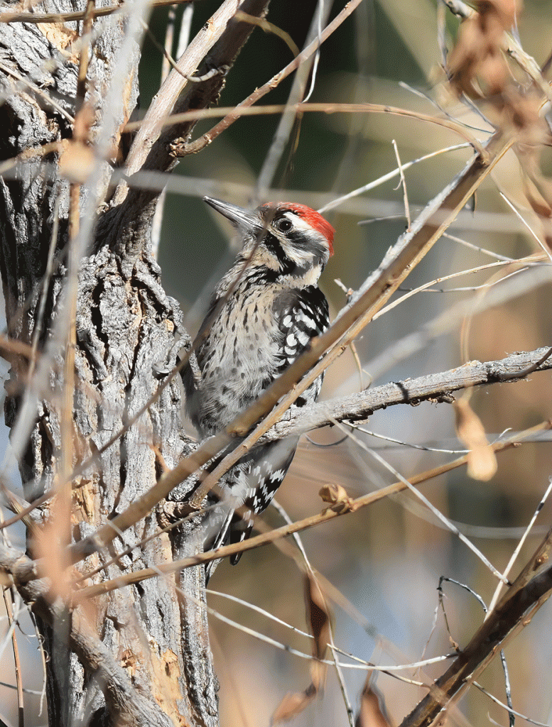 This Yellow-bellied Sapsucker is a bit bigger than a Ladder-backed Woodpecker and has a distinctive white patch on its wing like many other species of sapsuckers. This one was a rarity because it is out of its winter range, which should be Texas and parts east. It differs from the more common Red-naped Sapsucker by having less red and black, and more white on its head. Its yellow belly can be difficult to see and is sometimes almost absent. We really like to have a photo in order to be sure of our identification.