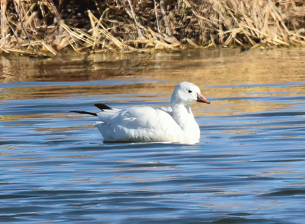 We visited the Amado Water Treatment Plant in hopes of seeing a Ross’s Goose. When we went in the morning, we couldn’t see it and wondered if it had flown away. We returned in the afternoon and it was easy to see. While we were there, it took off, circled and flew north. We thought we had been really lucky to see it before it left. Now we know that it came back and has been living there for a month and a half. Perhaps it will stay a lot longer. It’s very similar to a Snow Goose, but smaller.