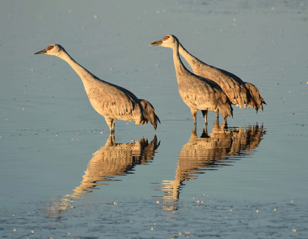 These Sandhill Cranes show their winter plumage. Their fresh gray feathers of late summer become more stained throughout the year, so they look rusty coloured by the spring.