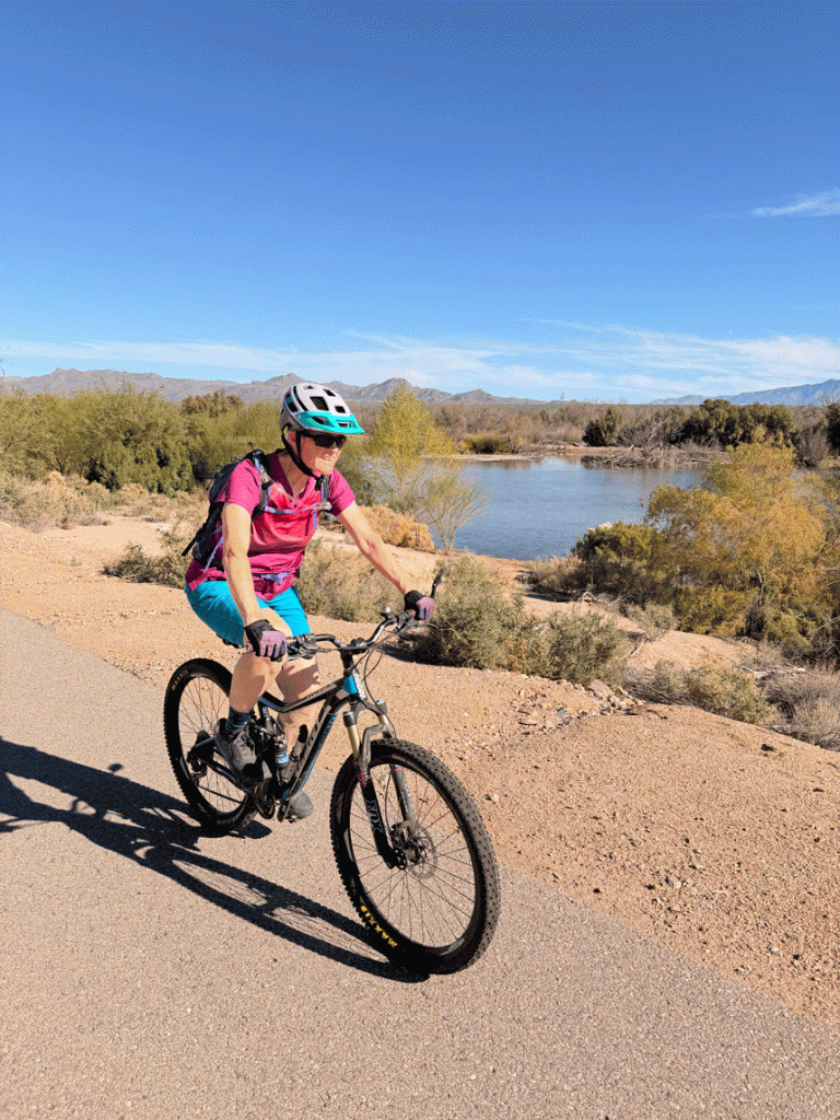 We did another bike ride on pavement, this one starting from El Rio Preserve and following the trail northwest to Sanders Road. Here’s a view as we came back past the preserve which is filling up with water.
