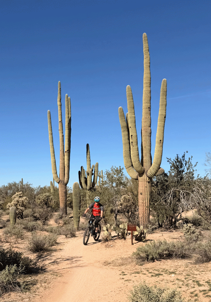 We rode the desert trails in the Tortolita Preserve a couple of times. Below, Wendy is riding past the “Candelabra” saguaro. Throughout the preserve, there are various signs at special landmarks, that also include the distance from the trailhead and the elevation.