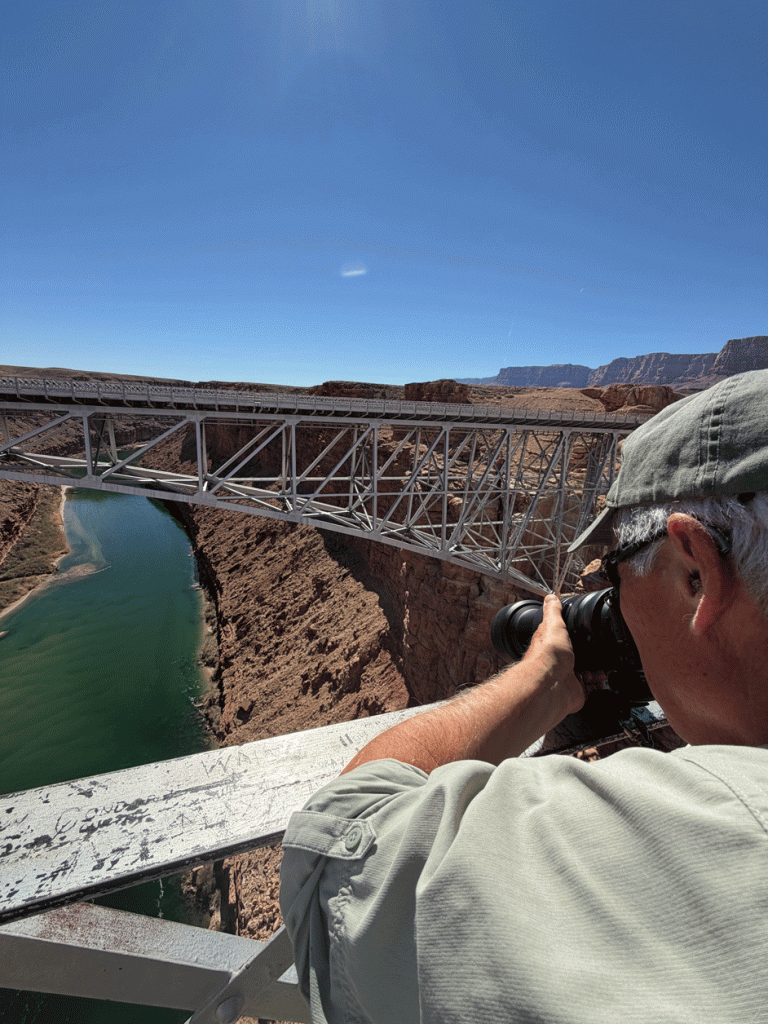 Around two o’clock, some other people saw the condors come in and alerted us. Our binoculars and camera gave us away as “birders.” We saw a couple of condors down in the rocks, and then another two perched on the main bridge. Below, Doug is taking a photo of one of the condors on the rocks.