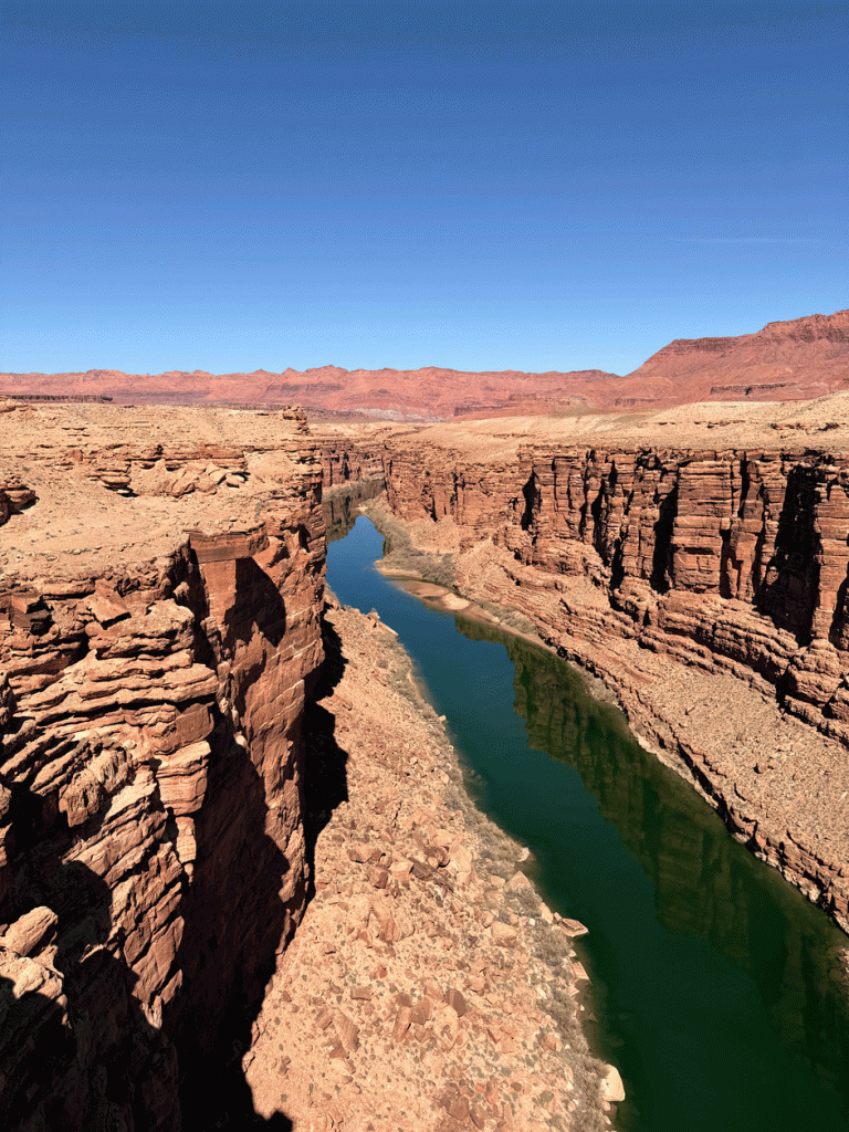We had allocated a couple of hours to see the thrasher and we were out of there in 45 minutes, so we had time to drive to see another bird. We continued past Flagstaff, north on US 89 highway, to the historic Navajo Bridge at Marble Canyon. Here’s a view of the Colorado River taken from the Historic Navajo Bridge, a pedestrian only bridge. We got there about 1:30 which was little early for the California Condors to be roosting. There were other birds around; Common Mergansers and American Wigeons way down on the river and House Finches flitting about.