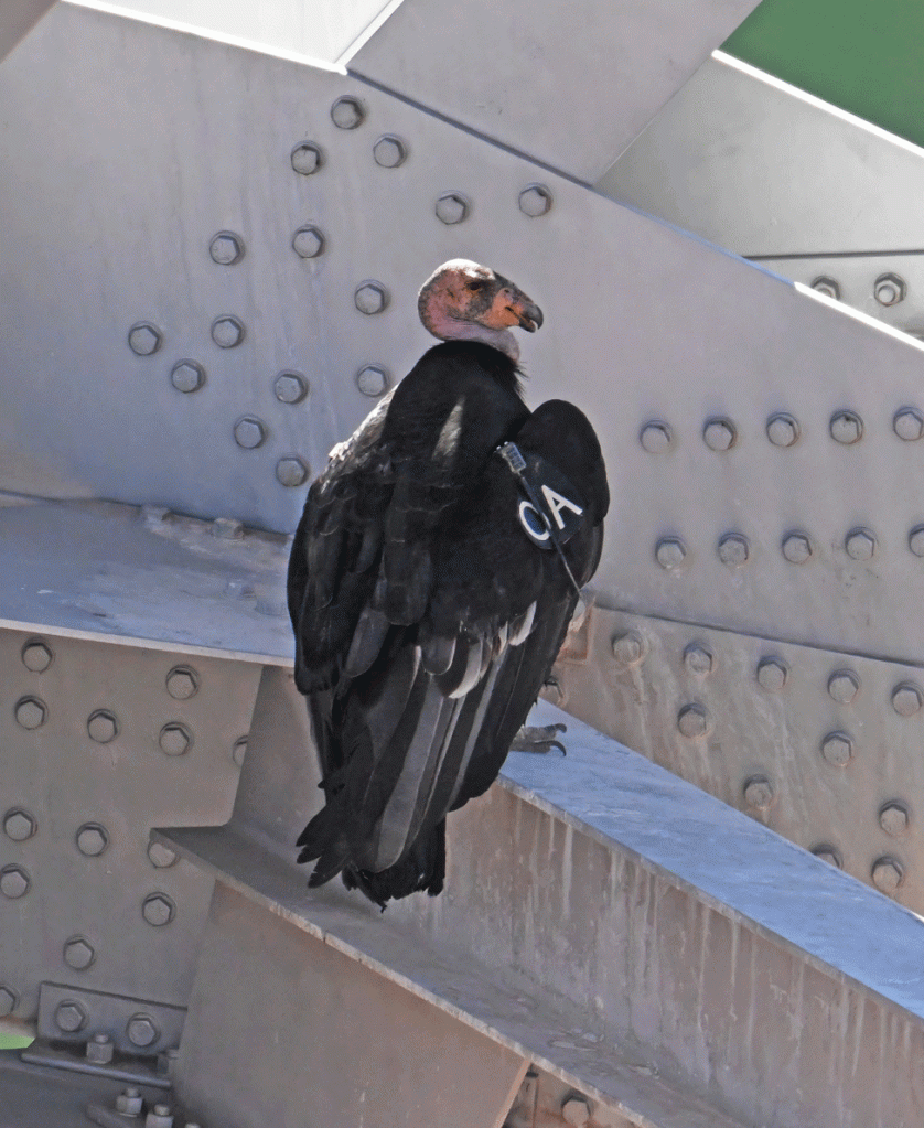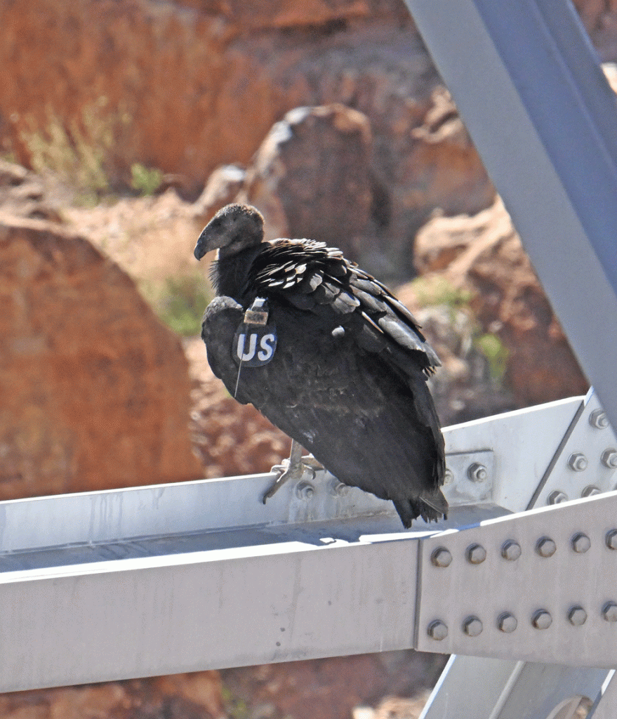 The California Condor is a critically endangered species that nest high on cliff faces. In the 1980s, the population fell to about 22 birds and now, with captive breeding intervention, there are over 275 free-flying birds. They have transceivers and labels so they can be tracked. We looked up the information about the bird with the OA tag on condorspotter.com and found out that OA is a female who is almost 5 years old. She was hatched at the World Center for Birds of Prey in Boise, Idaho. She was probably released at the Vermilion Cliffs Release site, which is nearby in terms of distances condors fly in a day. She was trying to sit in the shade of the girders on this hot day.