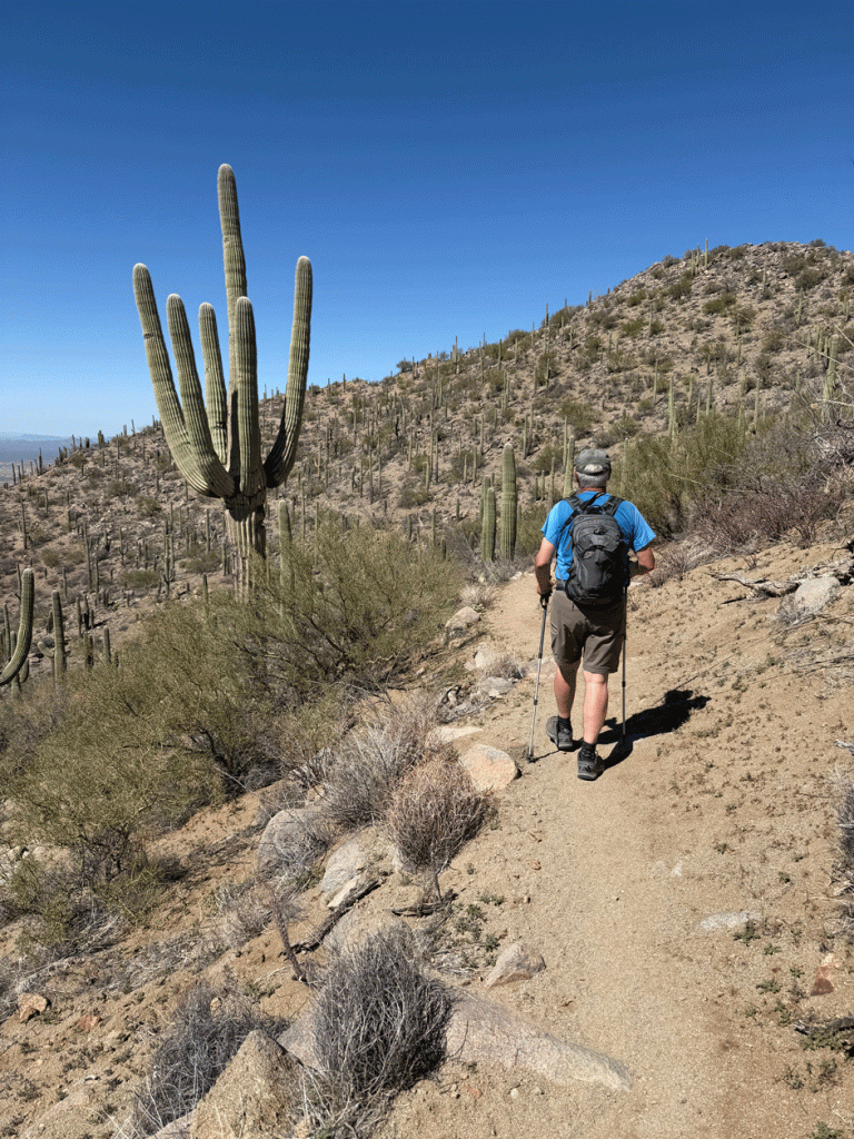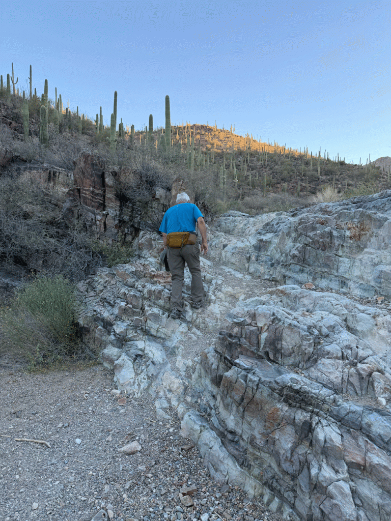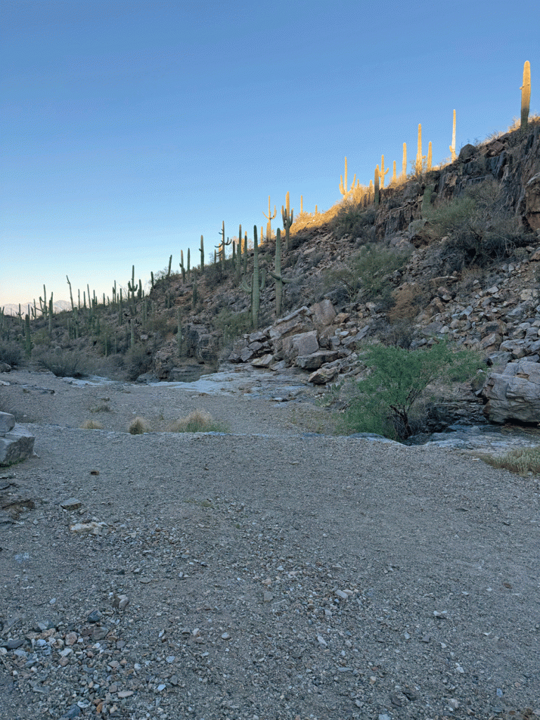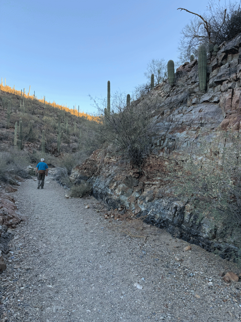 When we got back from Flagstaff, we expected that the heat wave would be over, and even though it wasn’t extremely hot, it was still hot. We got into a routine of waking up at 4:30 so we could be starting our activity at sunrise. This particular day, we wanted to go to the Desert Museum, but it didn’t open until 8:30. So at 6:30 am, we started our hike up King’s Canyon. The parking lot is just across the road from the Desert Museum. We’re always amazed at how the saguaros and other bushes can grow on the cliffside.