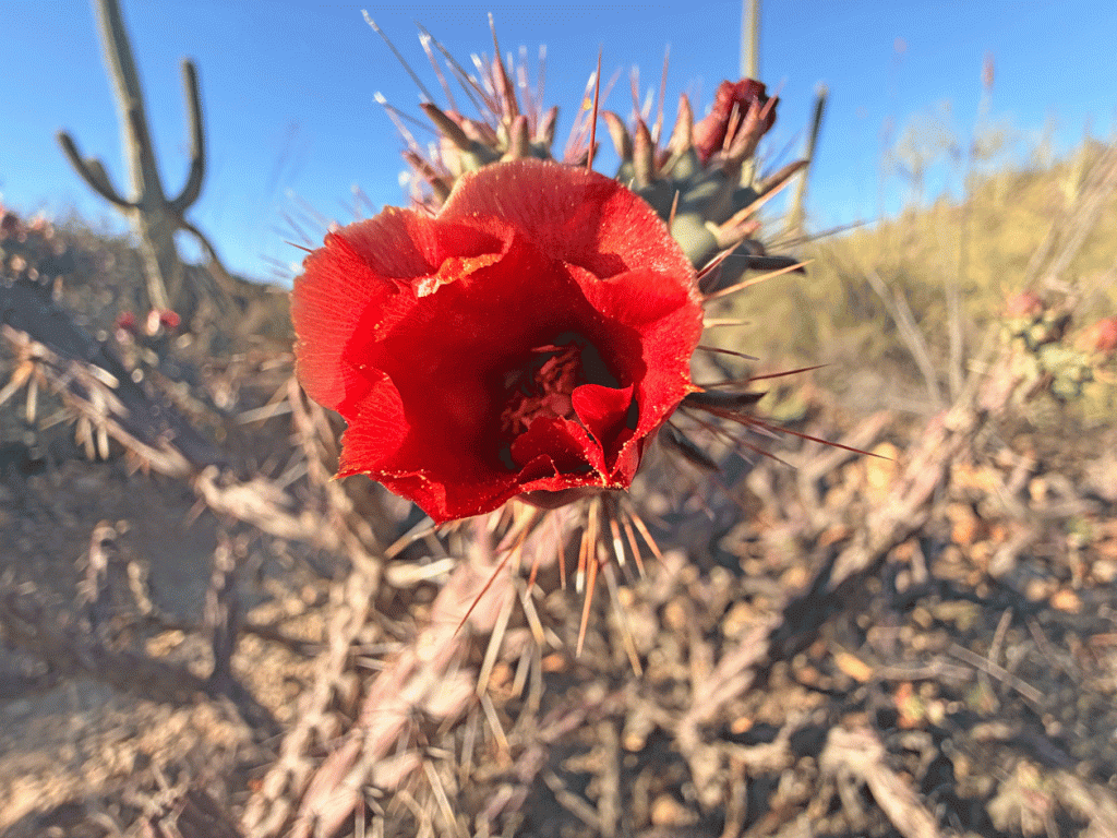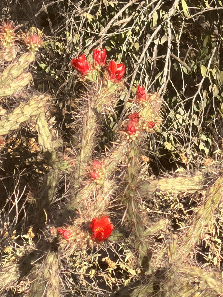 Here’s a photo of part a different Buckhorn Cholla to help with scale. Buckhorn Chollas have skinny arms with joints that are reminiscent of a deer’s antlers. The flower is only about five centimetres (2 inches) in size.