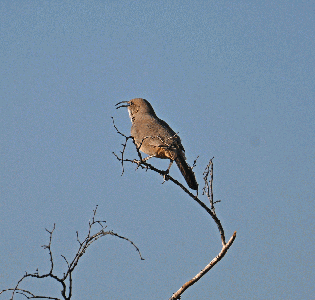 The thrasher is just barely visible in the photo below. It’s the highest speck above the bushes.