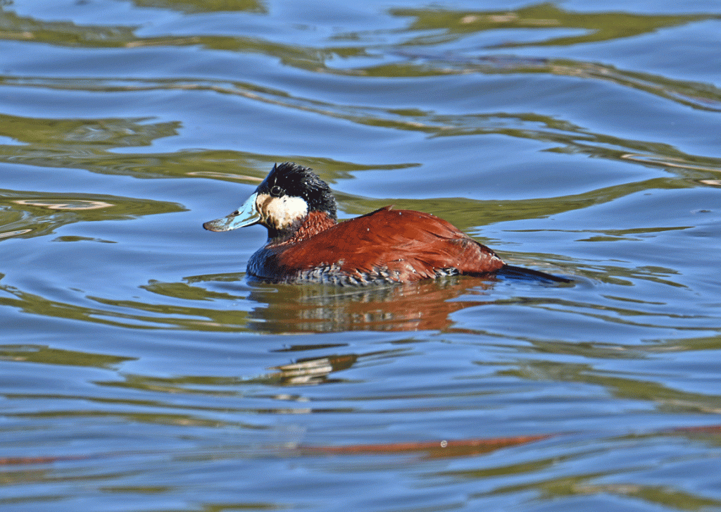 This Ruddy Duck has mud on it from its foraging efforts. We made it back to our trailer by about 3:00. It was 38 degrees C (100 F) outside and 30 (86 F) inside. Luckily we got the inside cooled off enough to be able to sleep.
