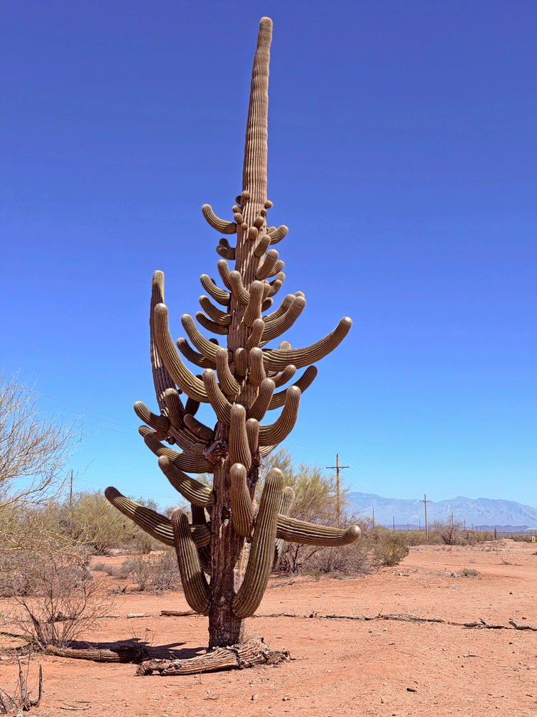 Another hot day, we took a drive out Avra Valley Road to the Ironwood Forest National Monument to see a spectacular saguaro. This saguaro has been named “Shiva” and reportedly has over eighty arms. A friend told us about it and we found out more information at the Friends of Ironwood Forest website. ( ironwoodforest.org ) The huge cactus can be seen from the road. There’s a parking area on the south side of the road, just past the second cattle guard. A circle of sticks surrounds the saguaro to help prevent its root structure from being damaged.