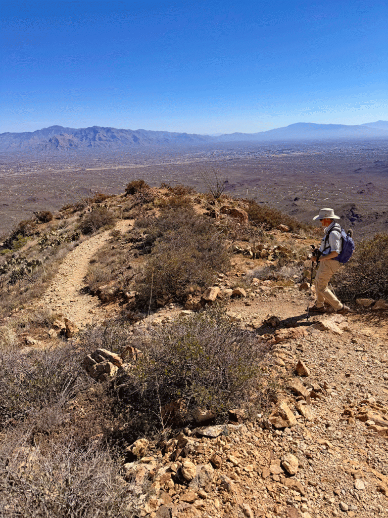 Before the heat wave, we made our annual hike up Wasson Peak in Saguaro National Park (West). Here’s the view from near the top looking down on Tucson.